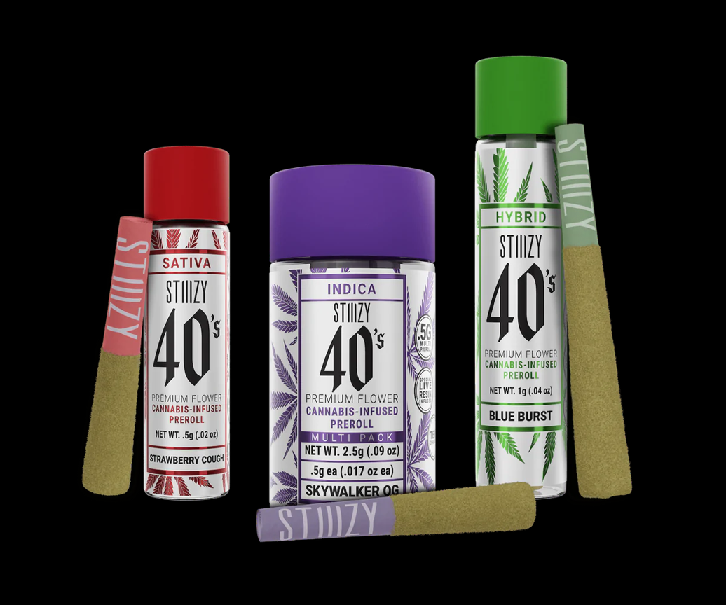 Elevate your pre-roll game. STIIIZY 40's infused pre-rolls are setting the standard with high potency, cannabis infused joints coated evenly with kief. Using our proprietary live resin infusion methods, we’ve designed every pre-roll to offer 40% cannabinoids (THC) potency with a unique flavor profile. With a smooth inhale and tasteful exhale, each and every STIIIZY 40's is packed with premium, cannabis flower, specifically made to ensure a potent and long-lasting high. Spark up the 40's.